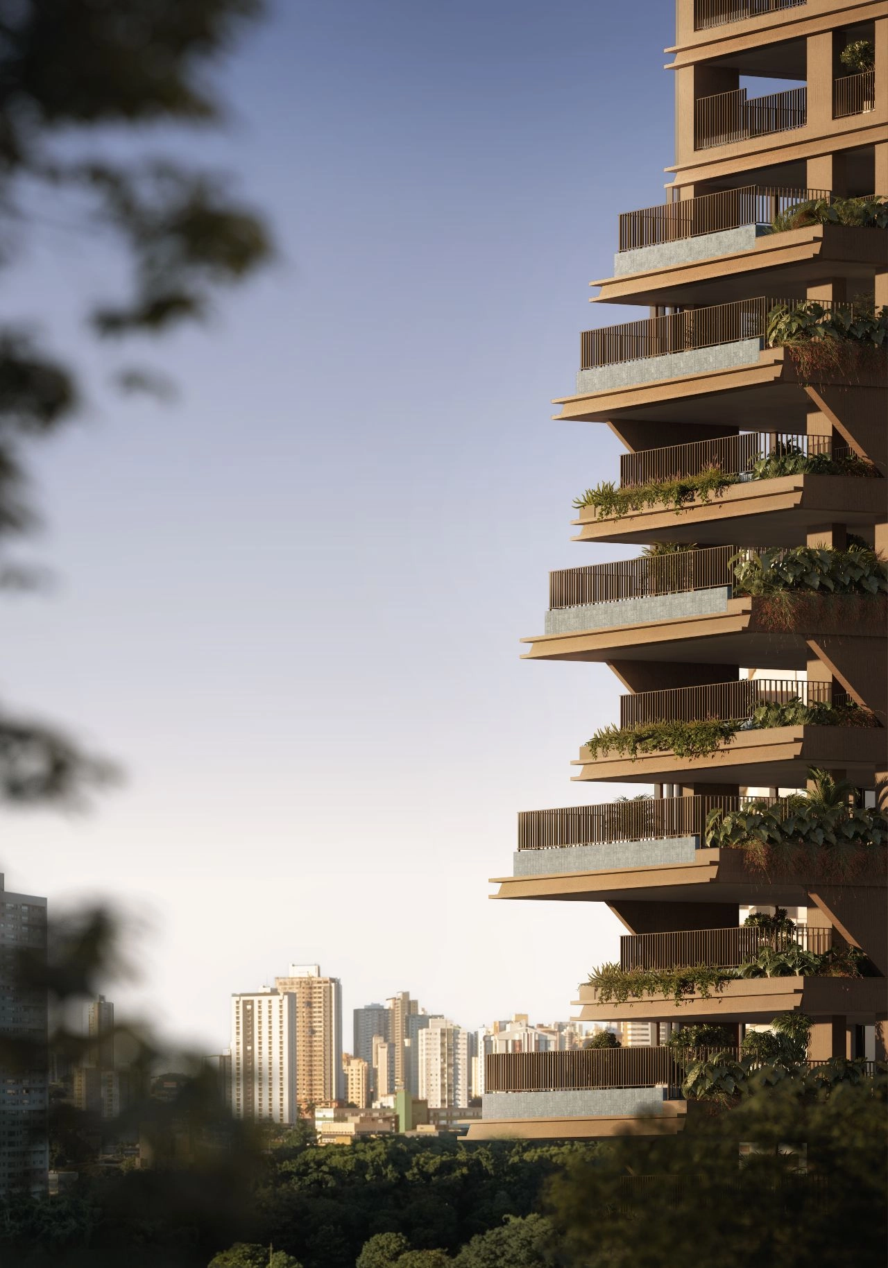 A Arquitetura Orgânica foi o ponto de partida para um projeto que não se impõe à natureza, mas dialoga com ela. Sua icônica horizontalidade nos terraços foi reinterpretada no movimento das varandas, que avançam e recuam em um ritmo visual único. No interior, o projeto traz ambientes que se abrem para o verde, diluindo as fronteiras entre o lar e a paisagem. O resultado são texturas e cores que valorizam os materiais brutos e se inspiram na vegetação local, criando uma experiência de viver em constante harmonia.